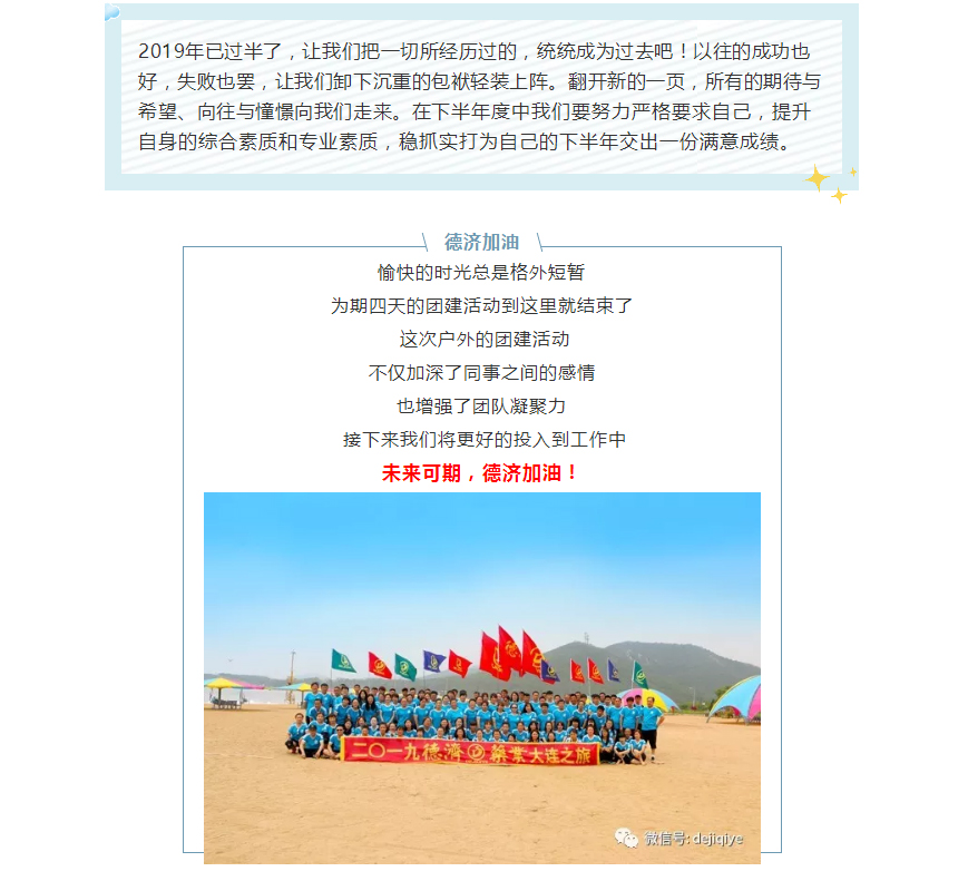 通過此次大連團建活動,豐富了員工的業(yè)余生活,讓大家體會到了公司的溫暖和關(guān)愛,也更好的提升了企業(yè)的凝聚力,提高了團隊共同面對問題時的處理能力,鍛煉了團隊為了共同的目標而相互配合,更好、更快的完成任務,充分展現(xiàn)了公司的團隊精神。